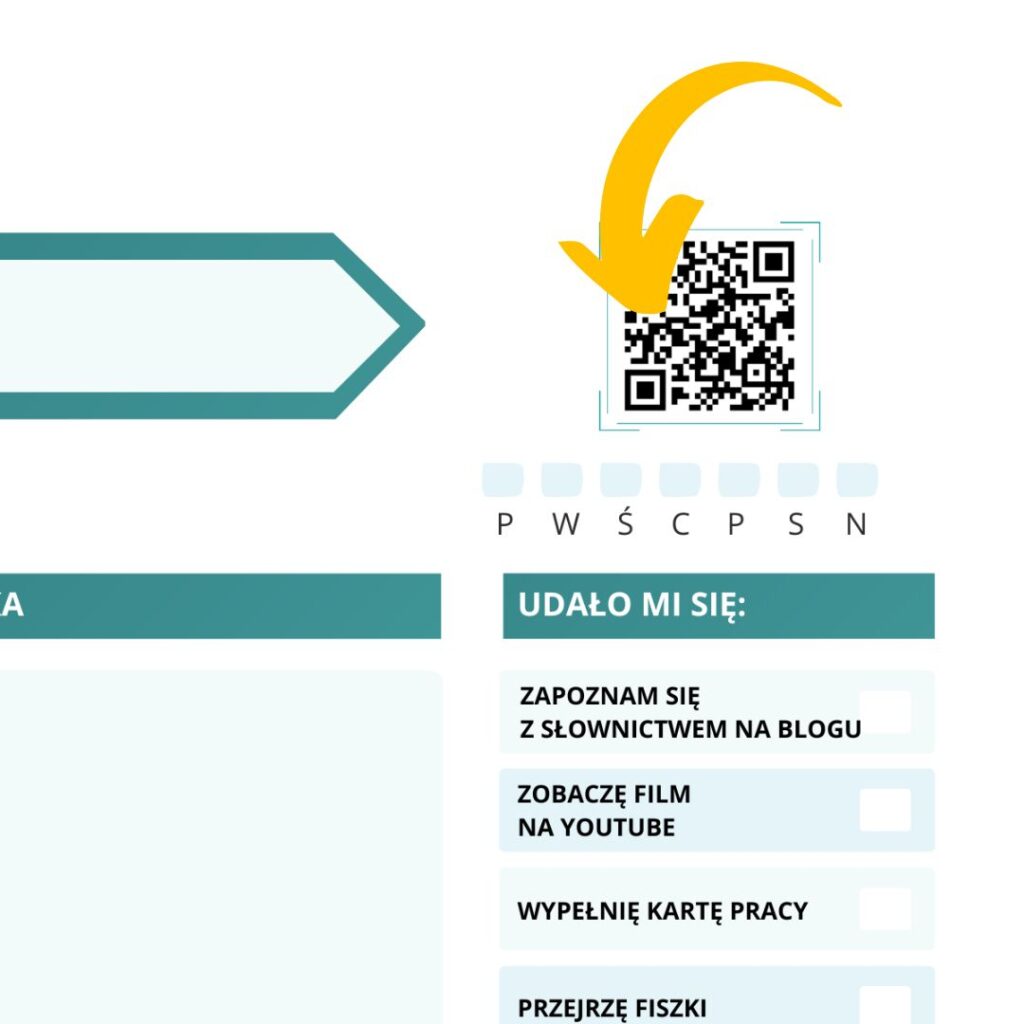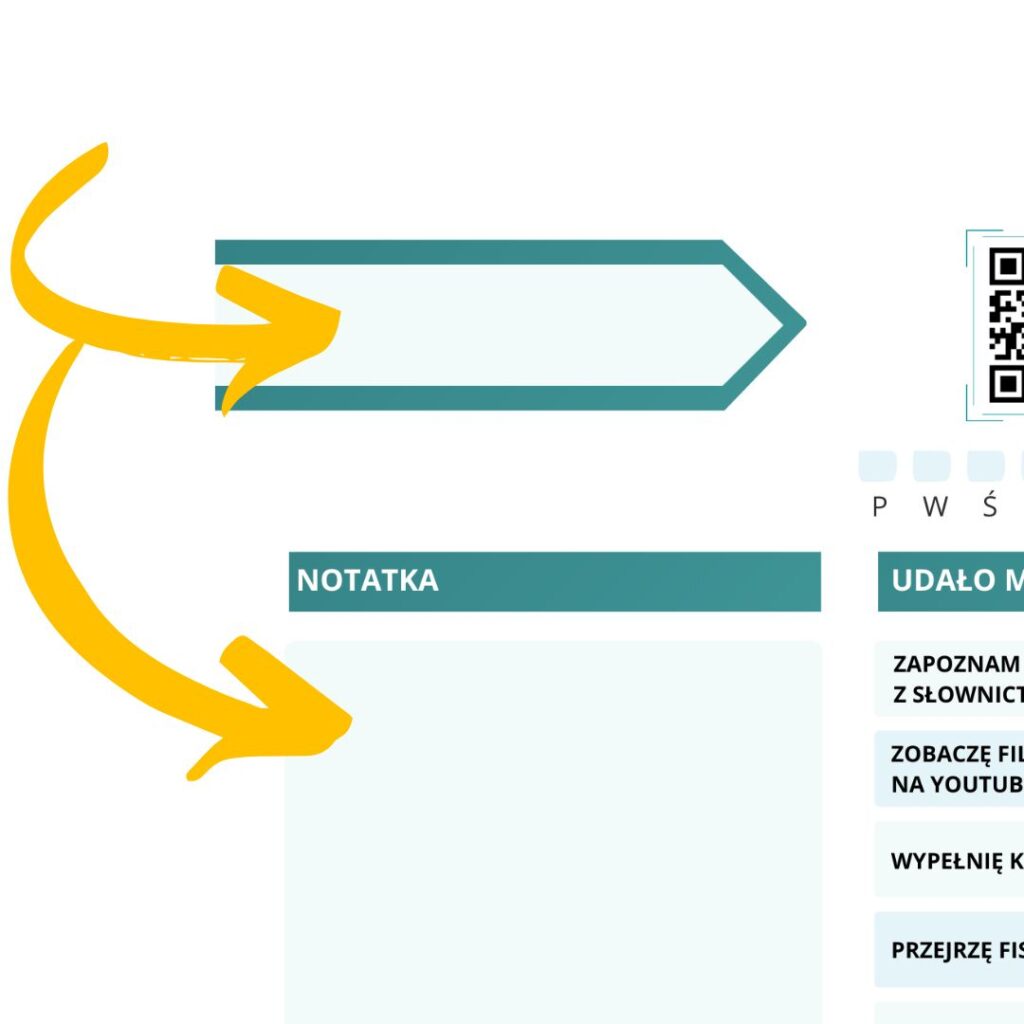 W notatce znajdziesz kod QR, który przekieruje Cię na blog Niemiecki z Frau Milberg. W każdym wpisie ze słownictwem znajdziesz linki do gier interaktywnych i filmu na YouTube.