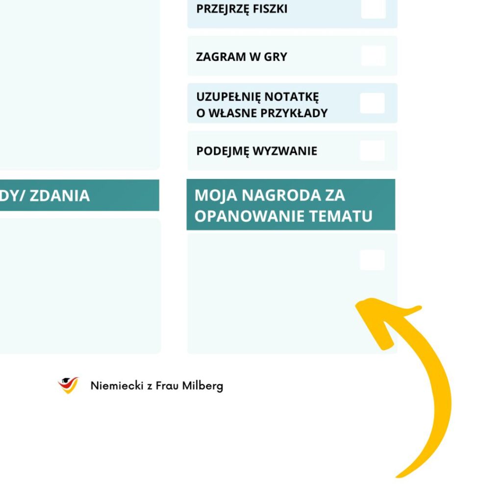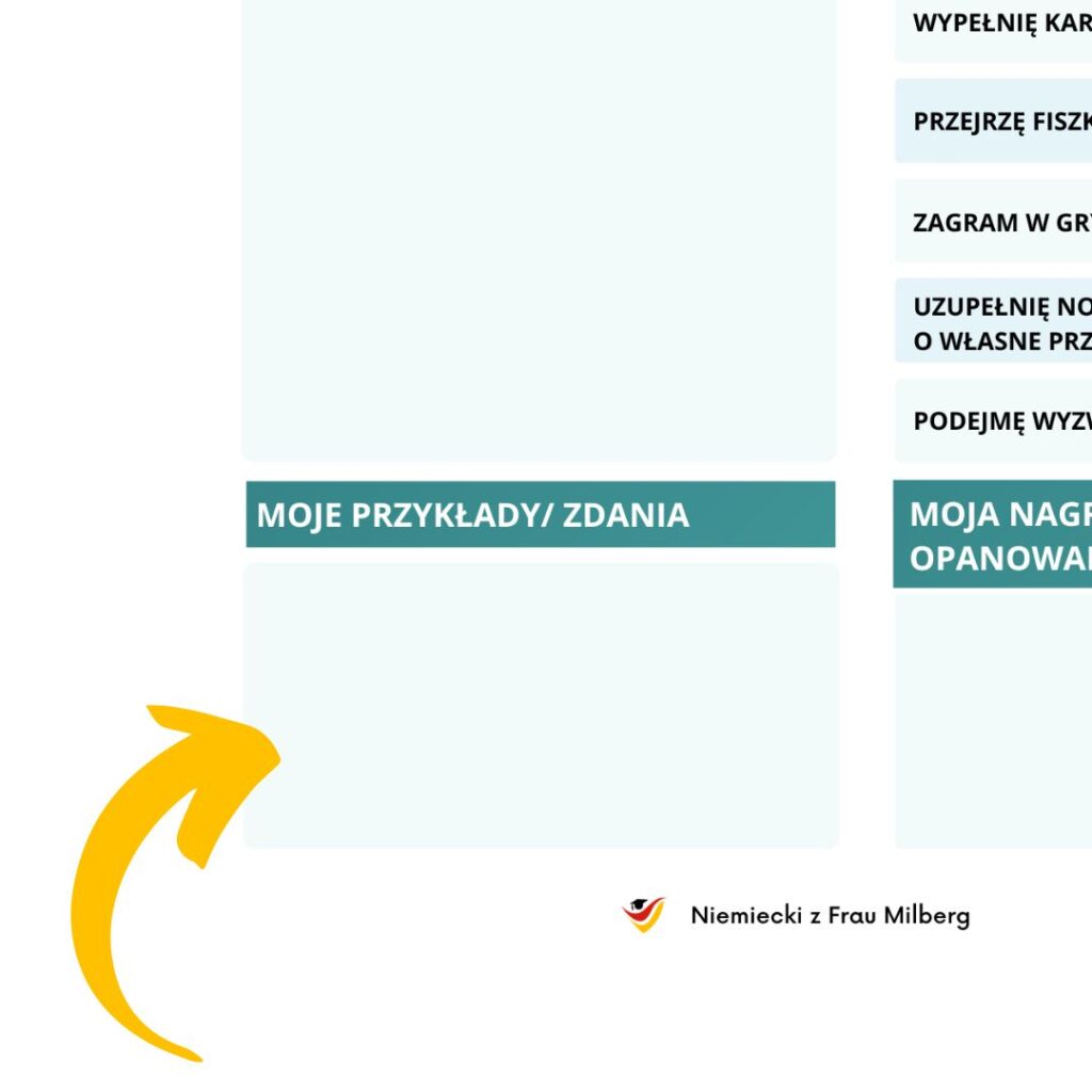 Pamiętaj, że nauka niemieckiego to długotrwały proces. Proces, który może być chaotyczny, frustrujący i męczący, jeśli nie wyznaczysz sobie celu i nie opracujesz opartego o Twoje potrzeby systemu przyswajania wiedzy. Nauka języka poprzez częsty kontakt z danym słownictwem daje nadspodziewanie dobre efekty. Dlatego zachęcam Cię do kliknięcia w poniższy przycisk i pobrania szablonu notatki. Ja pokazuję Tobie skuteczną ścieżkę nauki niemieckiego, a Ty ze swej strony zadbaj, by była ona oczywista, przyjemna, łatwa i satysfakcjonująca. I oczywiście by prowadziła Cię do wyznaczonego celu. Powodzenia!